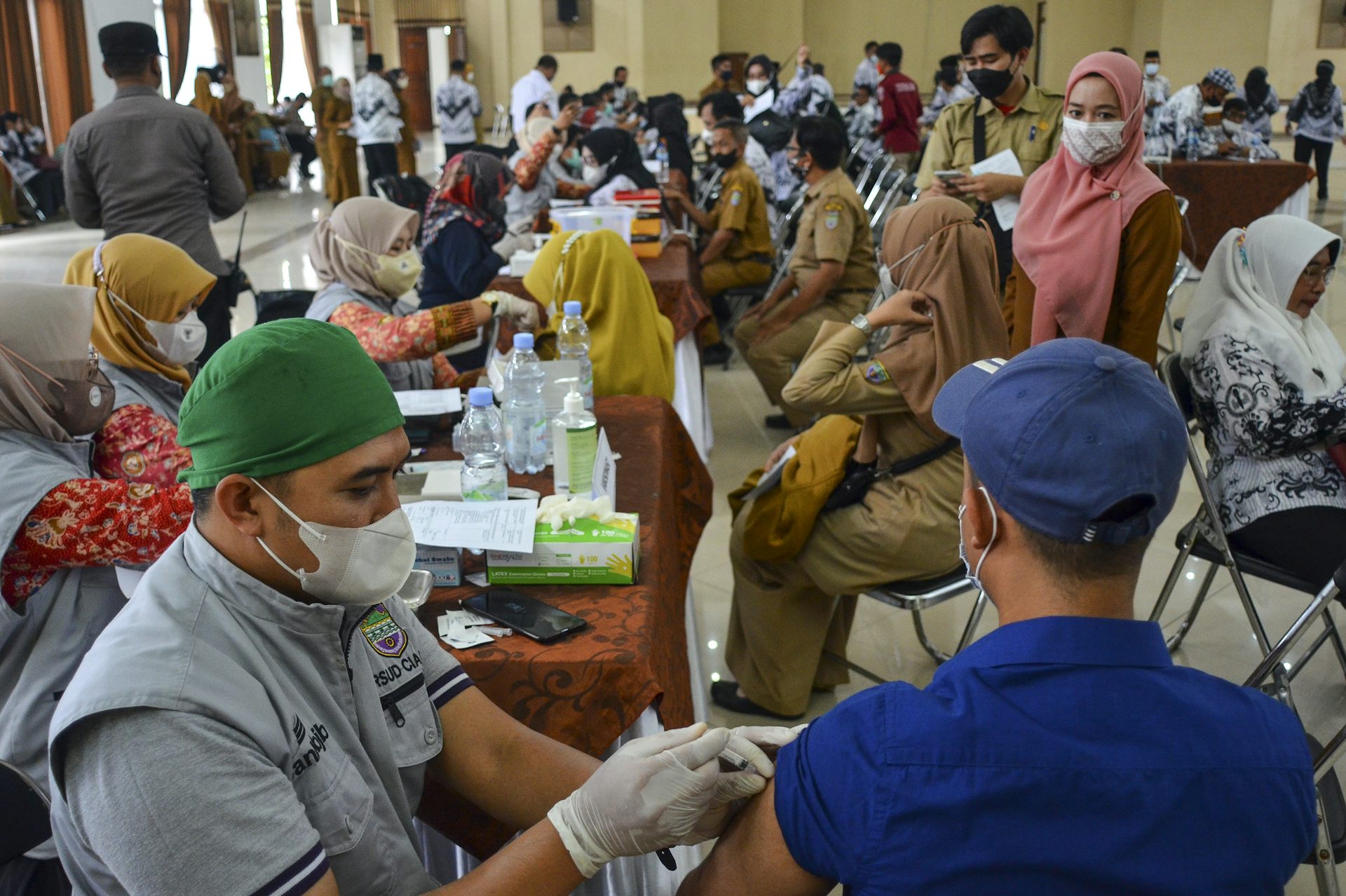 Tenaga kesehatan menyuntikkan vaksin COVID-19 dosis ketiga kepada petugas ayanan publik di Gedung Islamic Center, Kabupaten Ciamis, Jawa Barat, 14 Maret 2022.