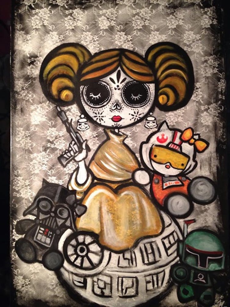 One example is San Antonio based artist Hector Garza. He combines popular Mexican themes and icons, including La Llorona, calaveras (representations of the human skull) and Frida Kahlo, with loteria (the Mexican game of chance) cards, comic book figures, and Star Wars, rendering them in a graphic playful style. Garza’s social realism paintings draw inspiration from Mexican social realist painters like Diego Rivera and José David Siqueros. Both styles of art represent a way of reconnecting with his Mexican roots.