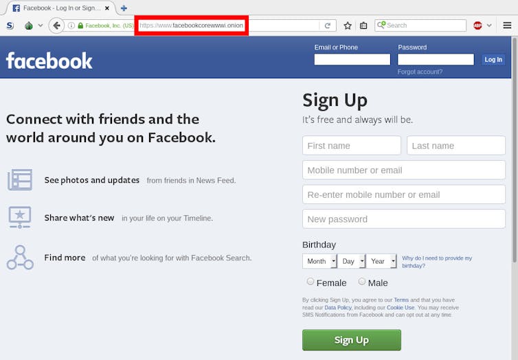 Another form of security causes the names of onion services to be harder to remember. Onion domains are not named like regular websites are: facebook.com, theconversation.com and so on. Instead, their names are derived from randomly generated cryptographic data, and often appear like expyuzz4wqqyqhjn.onion, which is the website of The Tor Project. (It is possible to repeatedly generate onion domains until a user arrives at one that’s a bit easier to recognize. Facebook did that and – with a combination of luck and raw computational power – managed to create facebookcorewwwi.onion.)