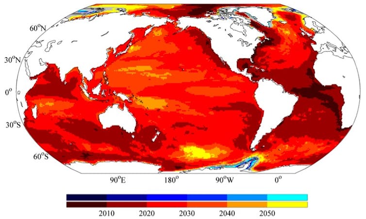 To estimate this time of emergence, we examined regional sea level in 17 state-of-the-art climate models and recently published regional sea-level projections, and compared them to the average sea level between 1986 and 2005.