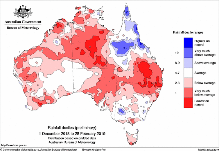 Spring 2018 saw a positive Indian Ocean Dipole which faded in early summer. At the start of summer sea surface temperature anomalies in the central Pacific exceeded 0.8°C, which is the typical threshold for El Niño affecting the oceans, but these declined as summer progressed. Combined with a lack of coupling between the atmosphere and ocean, the El Niño–Southern Oscillation remained neutral, though normal rainfall patterns shifted to oceans to the north and east, leaving Australia drier as a result.
