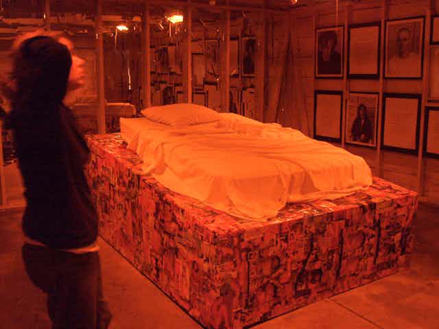 The 2002 installation “Rape Garage,” by Stefanie Bruser, Josh Edwards, Katie Grone and Lindsey Lee, was part of the “At Home” project at Western Kentucky University, which was facilitated by feminist artist Judy Chicago and her husband, Donald Woodman. Participants constructed installations that explored the themes of womanhood and manhood in different rooms of a house in Kentucky. As its name suggests, “Rape Garage” was an installation in the house’s garage. It highlighted the issue of rape by displaying statistics and posting first-person narratives of sexual trauma. It suggested that pornography encouraged rape and even included the fact that a man could be raped by a woman.