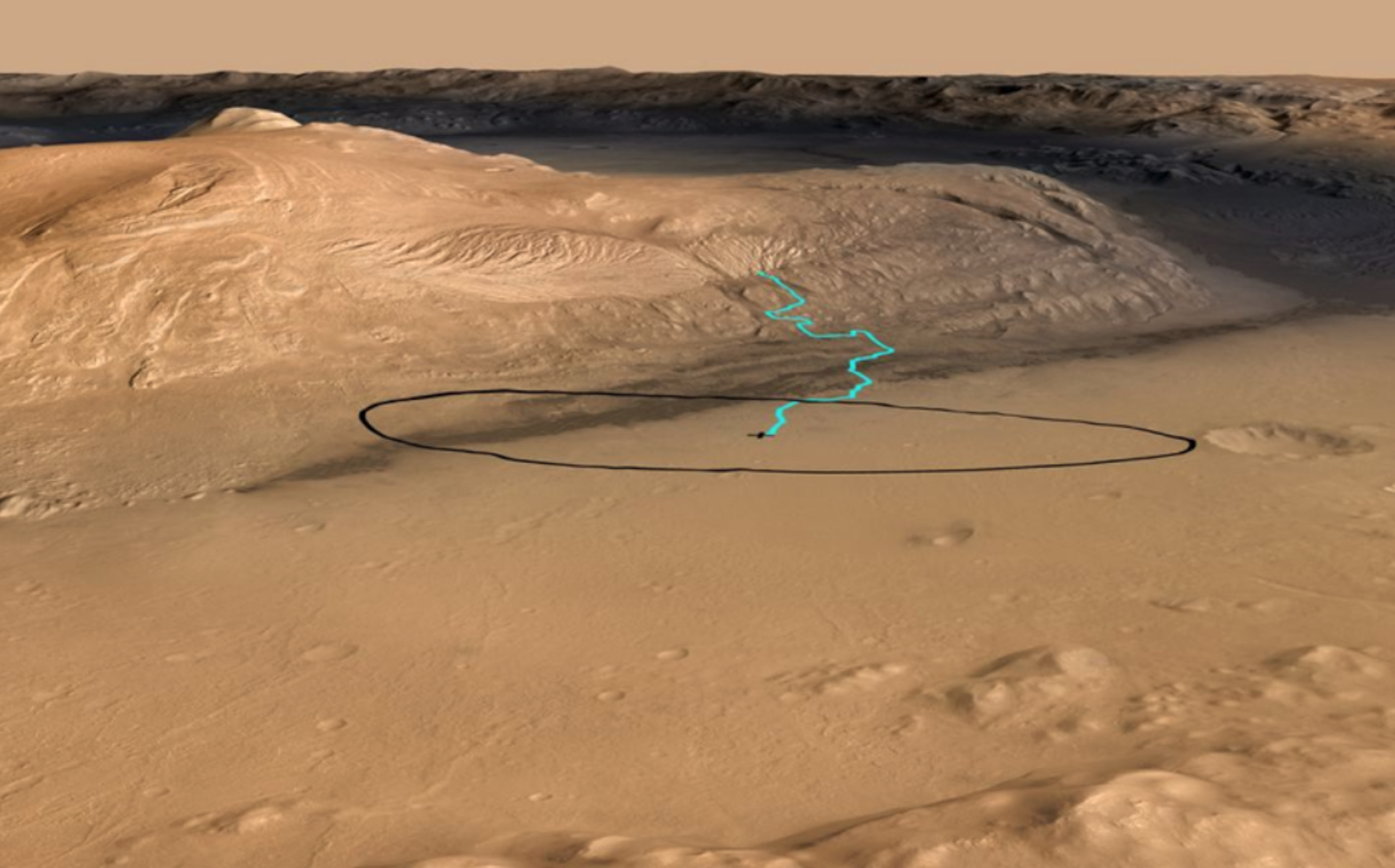 Mars, cratère Gale, 6 août 2012. Lancé par une fusée Atlas V, l’astromobile Curiosity est déposé en ce lieu, proche de l’équateur de la planète rouge. Rien d’un hasard car le cratère météoritique Gale, creusé il y a environ 3,7 Ga, présentait un double intérêt. D’abord, on pensait y trouver des alluvions amenées par une rivière (reconnaissable de nos jours par sa vallée sèche : Peace Valley), qui s’était déversée du plateau environnant dans le cratère : le rover était à même de chercher localement des traces, des résultats d’écoulements. De plus, à moins de 20 km, il y a des voies d’accès aux contreforts du Mont Sharp : des empilements de sédiments, quasiment superposés pendant des milliards d’années quand Mars était humide, et ensuite sculptés par l’érosion. Se déplacer sur le Mt Sharp permet aujourd’hui à Curiosity de travailler sur des sédiments plus facilement datables.