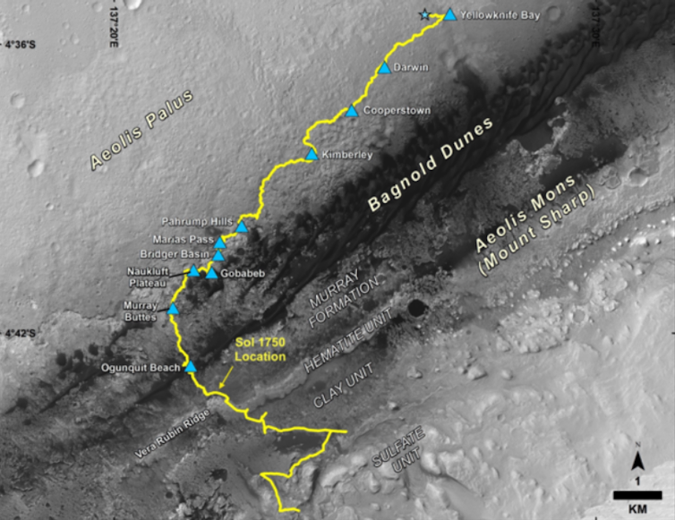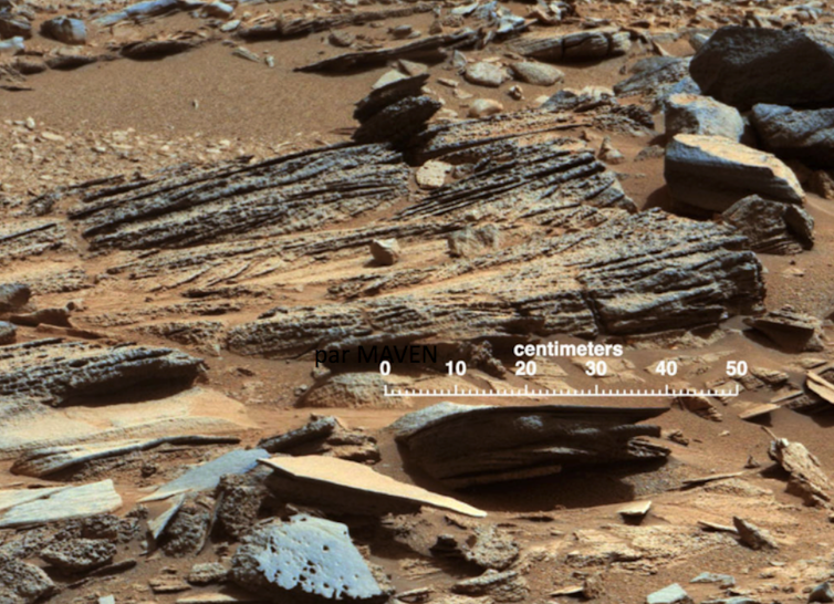 Sur Mars, les jours s’appellent des sol, numérotés à partir de l’atterrissage : après le sol 1400, soit 1 440 jours terrestres, Curiosity a commencé à se diriger vers des affleurements sur le Mont Sharp. Des évaporats contenant du bore ont alors été découverts par ChemCam ; cet atome, le bore, est fondamental pour la vie car il empêche la décomposition des sucres : c’est un atout supplémentaire pour l’habitabilité.