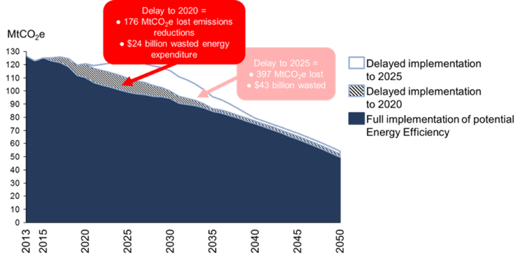 Just five years of delay could lead to A$24 billion in wasted energy costs and more than 170 million tonnes of lost emissions reductions by 2050. This is a very substantial loss, considering the current national emissions target aims to reduce emissions by 272 million tonnes by 2030.