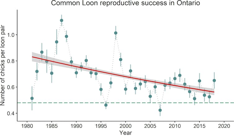 The data show that the number of chicks raised per loon pair has decreased in Ontario between 1981 and 2018, a trend seen across southern Canada.