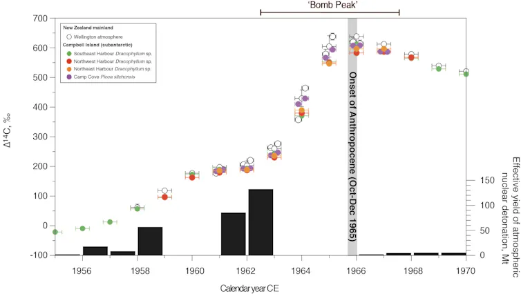 Nonetheless, the Campbell Island tree is growing exceptionally well – at a rate five to ten times faster than surrounding native shrubs – which gave us plenty of data to work with. Detailed analysis of the tree’s year-by-year growth shows the peak in radioactive elements took place sometime between October and December 1965, which coincides with the same signal in the Northern Hemisphere. This spruce has demonstrated unequivocally that humans have left an impact on the planet, even in the most pristine of environments, that will be preserved in the geological record for tens of millennia and beyond.