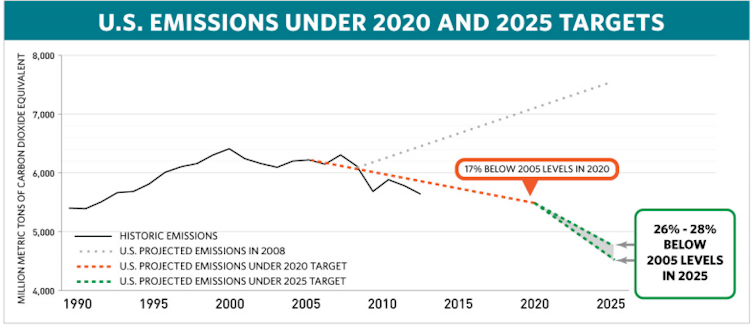 The US pledge, officially called the Intended Nationally Determined Contribution (INDC), details the progress made to date: emissions are on a downward trajectory, but reductions need to accelerate in order to realize its 2025 pledge.