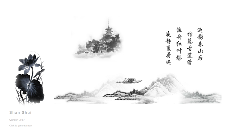 The title of Qianxun Chen’s work Shan Shui means mountain and water in Chinese, and landscape when combined as shanshui. It also refers to traditional Chinese landscape painting and a style of poetry that conveys the beauty of nature. With each click, a new Shan Shui poem is generated with a corresponding Shan Shui landscape painting.