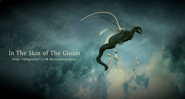 Australian digital artist Mez Breeze’s V[R]ignettes is a virtual reality microstory series. The audience can experience this work by donning a virtual reality headset or viewing it in 3D space in browser. Each V[R]ignette combines poetic text, 3D models, and atmospheric sound design. The reader (or user) can navigate by clicking on the “Select an annotation” bar at the bottom of the screen, or simply look around in 3D space and freely explore the work.