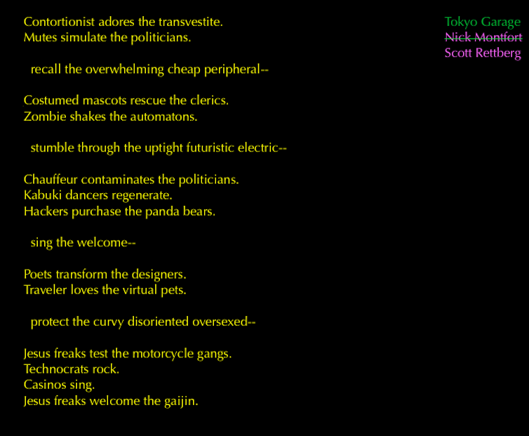 Montfort writes: “If others could go to a place of natural beauty and write a poem about that place, why couldn’t I write a poetry generator, instead?” Scott Rettberg then took the code from Montfort’s poem and replaced the vocabulary to produce Tokyo Garage, turning Montfort’s minimalist nature poem into a maximalist urban poem.