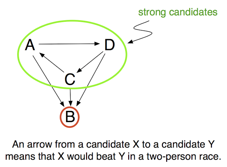 Unfortunately, when there are more than two candidates, this principle can easily rule out everyone. There can be a situation where, say, 55 percent of voters prefer Candidate A to Candidate B, 60 percent prefer B to C and 65 percent prefer C to A.