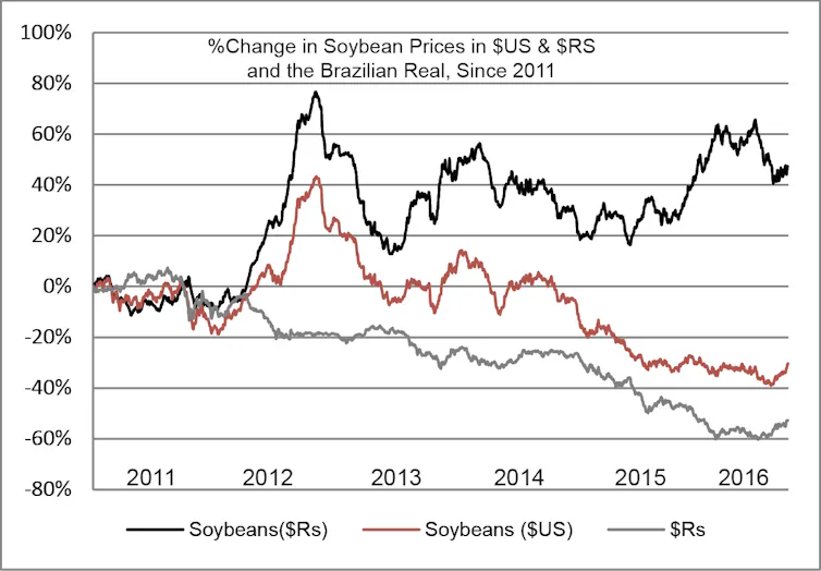 Brazil’s current economic collapse is once again creating windfall conditions for soybean farmers. Over the past year and a half, the cracks in the country’s economy have become rifts and the real has lost more than one-third of its value. The farther the currency falls, the higher soybean prices rise. From 2011 to 2016, soybean prices increased by 70 percent, peaking in January 2016.