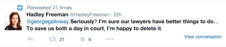 Galloway had argued that his anti-Israel stances on a number of issues have not spilled over into anti-Semitism. Freeman disagrees, although she has since deleted the tweet saying as much.