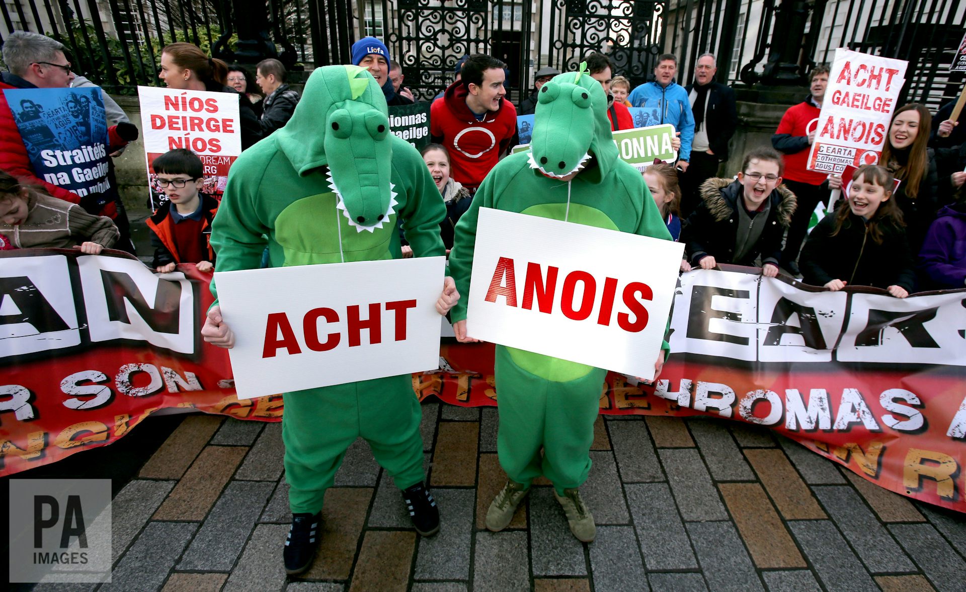 Protestors outside the High Court in Belfast in February 2017 calling for an Irish Language Act.
