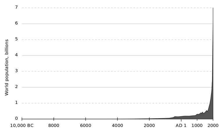 Over longer timescales, the recent increases look practically vertiginous. We seem to be on a trajectory that would surely exceed whatever the carrying capacity of the Earth is. However, 11 billion could be the high water mark as the UN forecasts population to slowly decrease after the end of this century.