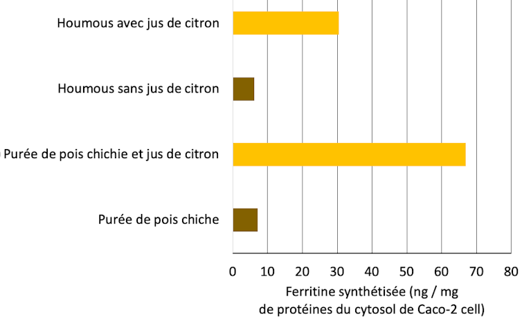 Dans nos modèles, l’absorption du fer est plus importante pour la purée de pois chiche que pour le houmous, mélange de pois chiche et de purée de sésame. La purée de sésame contient en effet de l’acide phytique, ce qui accroît la rétention du fer par la matrice alimentaire. Quant à l’action positive du jus de citron, notre hypothèse est que l’acidification a permis de libérer une partie du fer « complexé ».