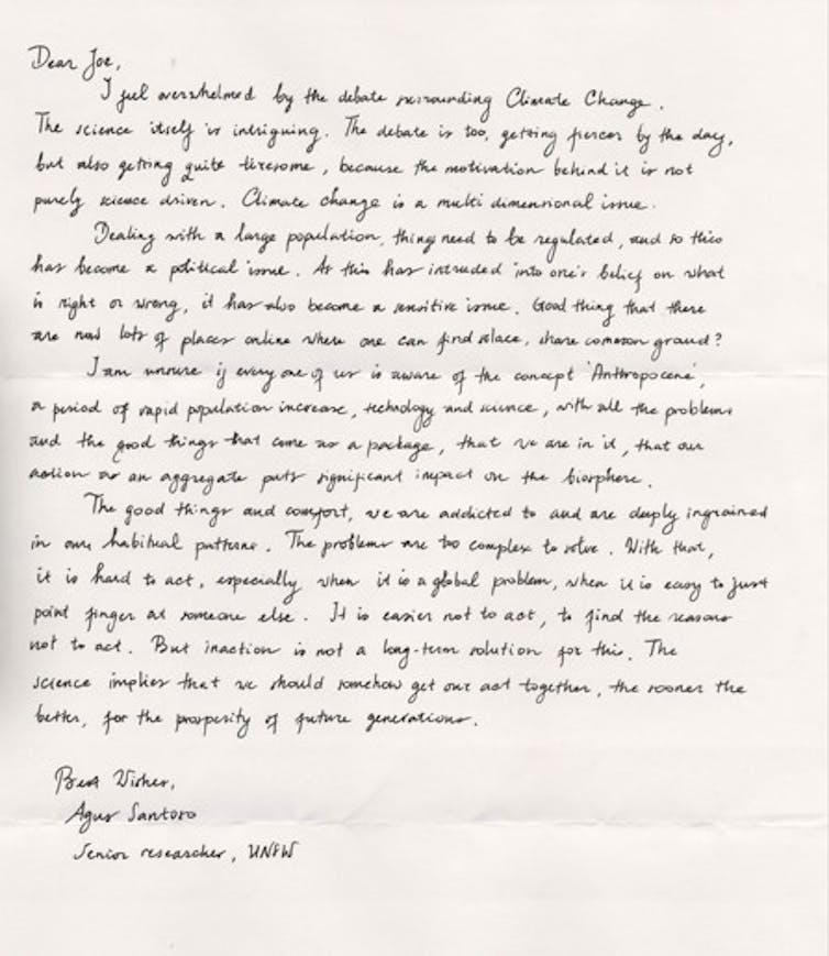 Between 2014 and 2020 one of us, science communicator Joe Duggan, approached climate scientists around the world and asked them: “How does climate change make you feel?” He collected their responses in the form of short, hand-written letters. Five years after the initial “Is this how you feel?” project launched, he returned to some of the original contributors and asked them the same question. These letters were shown in galleries and housed online.