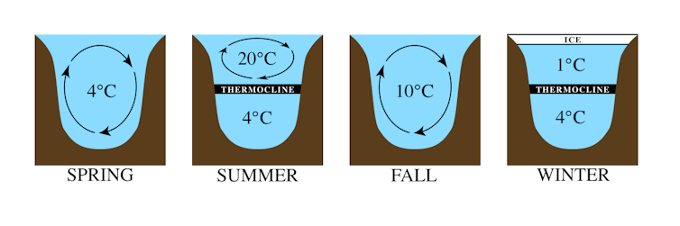 As anyone who has swum in a lake knows, the water is typically warmest on the surface where the sun shines on it. Cold water is denser than warmer water, so it sinks. For much of the year, deep lakes will remain stratified (separated into layers).