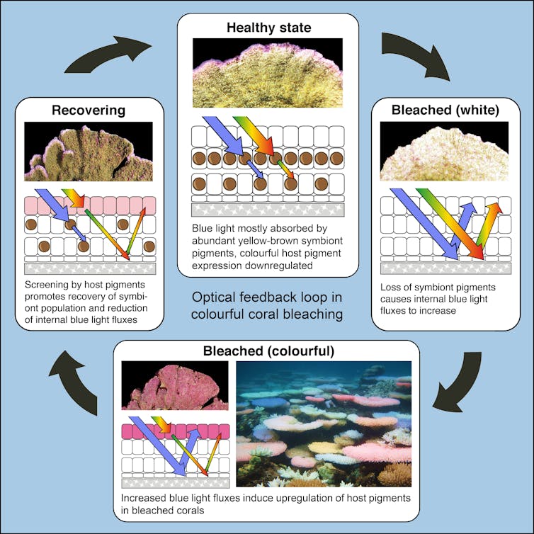 If the coral cells can still carry out at least some of their normal functions during bleaching, the increased internal light levels boost the production of colourful pigments which protect the coral from light damage, forming a kind of sunscreen layer that allows algae to return. As the recovering algae start absorbing light for photosynthesis again, light levels inside the coral drop, and so the coral stops producing as much of these colourful pigments.