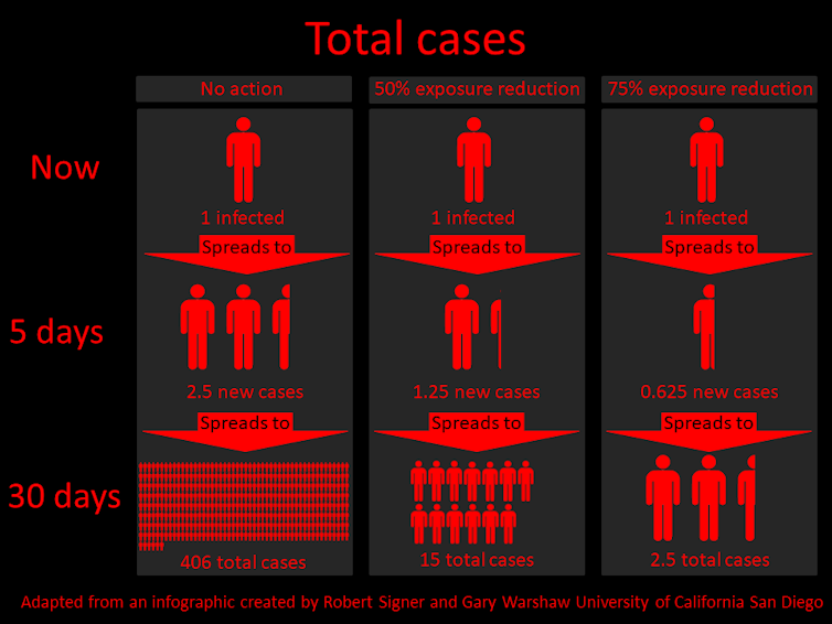 You may have seen a version of the infographic (below) that explains the potential impact of social distancing. It nicely illustrates that reducing the total number of disease-spreading contacts each infected person has can have a dramatic effect on the total number of infections a short time later. The numbers rely on the mathematical concept of “exponential growth”.