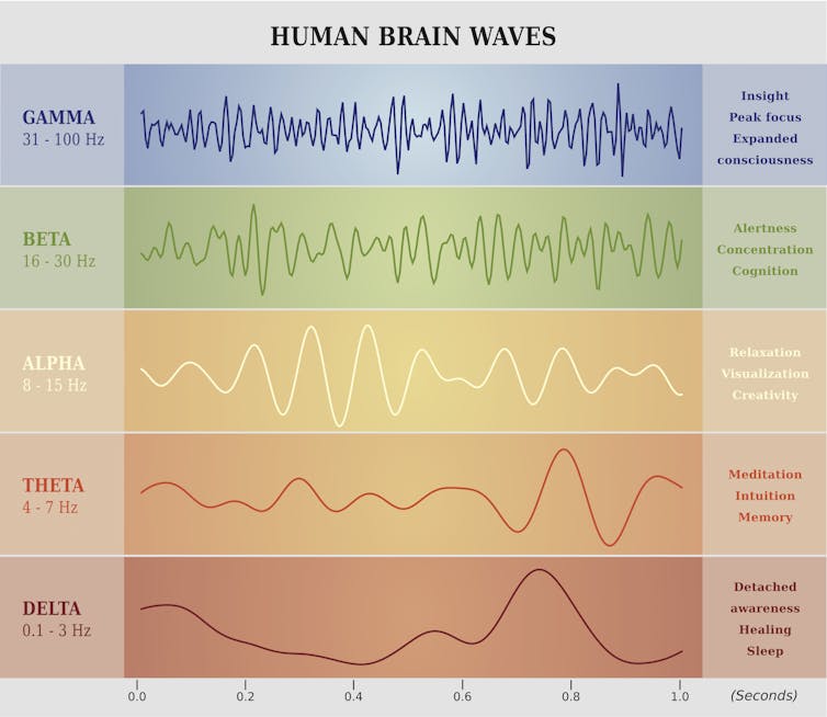 Fries focuses on gamma, beta and theta waves. These labels refer to the speed of electrical oscillations in the brain, measured by electrodes placed on the outside of the skull. Groups of neurons produce these oscillations as they use electrochemical impulses to communicate with each other. It’s the speed and voltage of these signals that, when averaged, produce EEG waves that can be measured at signature cycles per second.
