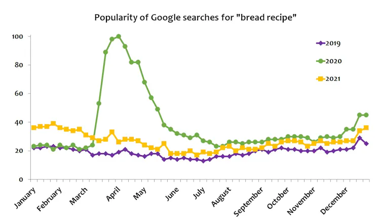 Major societal changes like restaurant closures, home schooling and teleworking came with an increase in frequency of cooking at home and improved food-related skills like cooking and meal planning. Many Canadians have learned new recipes, and the much-reported rise in the popularity of baking is corroborated by a drastic increase in online searches for bread recipes in the first weeks of the pandemic (which remained higher than pre-pandemic until well into 2021).