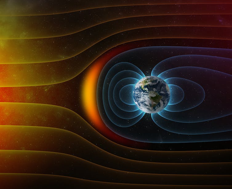 The Earth’s magnetic field protects life on the Earth’s surface from harmful particles coming from the sun. It also keeps the planet’s atmosphere in place and helps animals to find their way around.