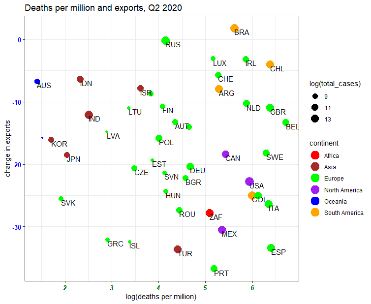 If there was a clear trade-off between containing the virus and enabling international trade, we would see a positive relationship between the changes in exports and death-rates. Instead, there appears to be no relationship.