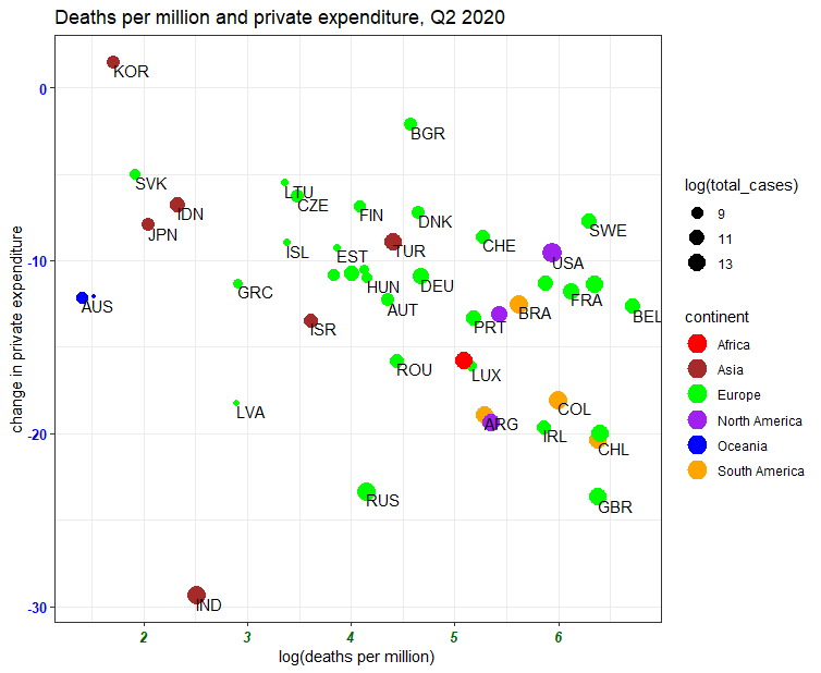 Our fourth chart shows the relationship between deaths per million and percentage change in private consumption expenditure. This complements the picture we get from imports and exports, by tracking consumer spending as an indicator of internal economic activity.