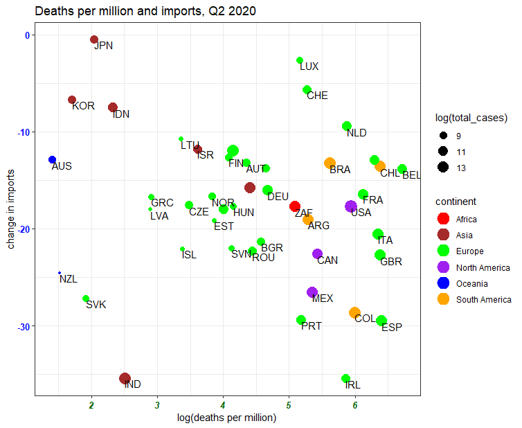 Our third chart shows the relationship between deaths per million and percentage change in imports. As with exports, a trade-off would show in a positive relationship. But there is no evidence of such a relationship here either.