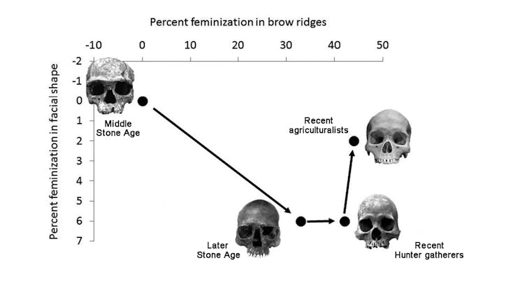 Cieri and colleagues found the brow ridge (the bony bit above the eye sockets) became significantly less prominent and male facial shape became more similar to that of females. They referred to this as craniofacial feminisation, meaning that as Homo sapiens slimmed down their skulls became flatter and more “feminine” in shape.