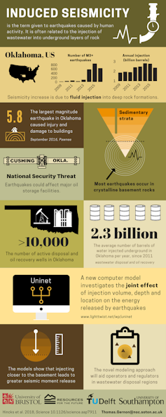 Scientists attribute this unprecedented increase in seismicity to the oil and gas industry injecting its wastewater (known as “saltwater”) deep underground. In a study published in the journal Science, my colleagues and I have now shown that the size of these man-made earthquakes is strongly linked to the depth at which the saltwater is injected. As a result, reducing the depth of injections could significantly reduce the likelihood of larger, damaging earthquakes.
