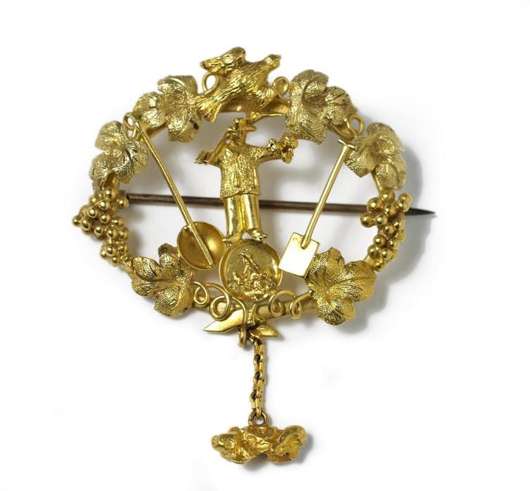 If Lola’s ersatz feet were to touch the ground, she’d find herself surrounded by the most extraordinary collection of goldfields’ jewellery. Over 250 pieces of finely wrought gold, often depicting the tools of the trade that earned diggers the cache that allowed them to purchase such pieces of adornment, often for the first time in their lives.