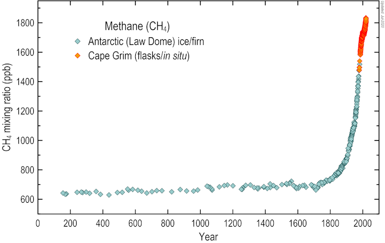 Methane concentration in the atmosphere reached 1,875 parts per billion at the end of 2019 – more than two and a half times higher than pre-industrial levels.