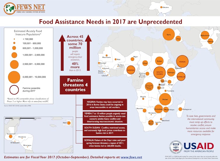 Moreover, in January the Famine Early Warning System (FEWSNET) – a U.S. government-funded organization created in 1985 specifically to predict famines and humanitarian emergencies – estimated that 70 million people affected by conflicts or disasters worldwide will need food assistance in 2017. This number has increased by nearly 50 percent in just the past two years.