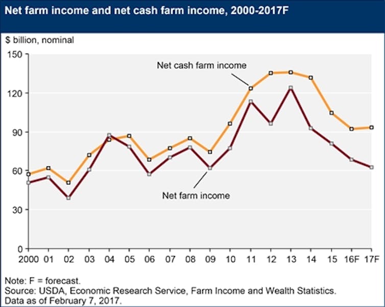 Recently the farm economy has soured. After several years of historic profitability, 2017 looks to be the fourth straight year of declining income. American farmers face forecasts of stagnant to declining revenues.