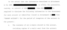 It’s very difficult to get a copy of one of these search warrants, thanks to orders sealing files and gagging companies. But in another Microsoft lawsuit against the government a redacted warrant was made part of the court record. It shows how the government asks for – and receives – the power to look at all of a person’s email.