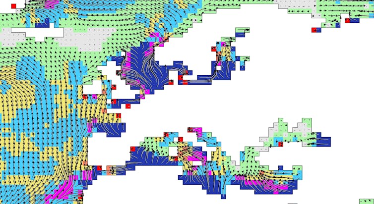 However, a key finding of this study is that geographic features such as coastlines create barriers for marine life that may be tracking shifting temperatures. By mapping where these barriers influence potential migrations around the globe it may be possible to identify places where the movement of species biodiversity might be blocked.