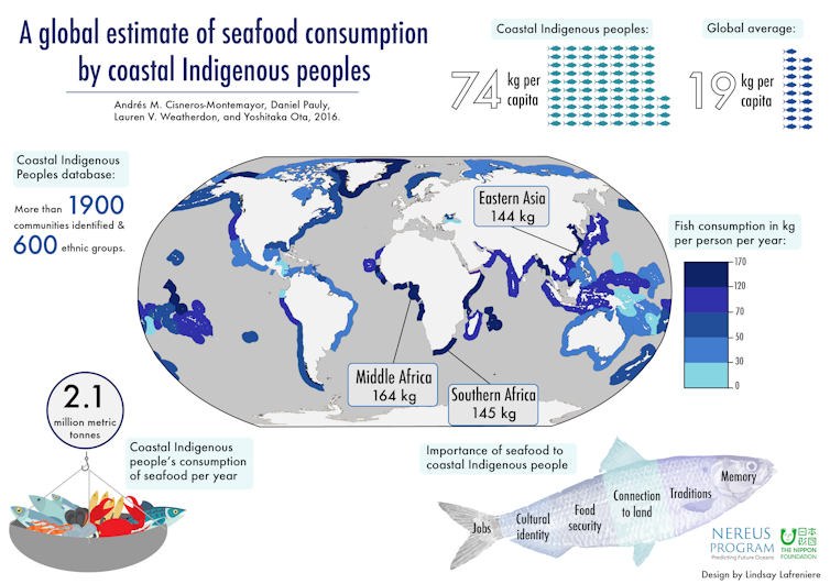 We estimate that 27 million coastal indigenous peoples consume 2.1 million metric tonnes of seafood per year. Compared to the global average of 19 kilograms (41 pounds) of seafood per person, these individuals consume 74 kilograms (163 pounds). Although they are becoming increasingly integrated into global food systems, coastal indigenous communities with cultural ties to the ocean on average eat 15 times more seafood than nonindigenous people in the same country.