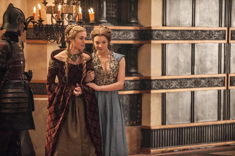 The way women held themselves in these dresses, with clasped hands in front of the waist (helping to show off those sleeves), can also be seen in Cersei when she wears her dress. The style both empowers and constrains women.