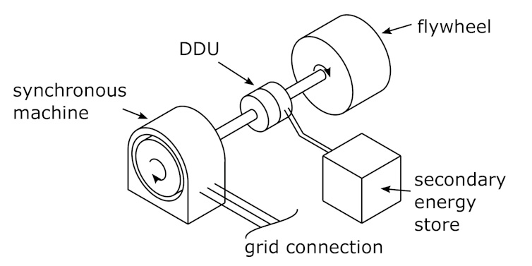 In traditional power stations and synchronous condensers, only 4% of the kinetic energy in the rotors can be used. But there are solutions that capture all of the advantages of actual spinning metal while also enabling the entire store of kinetic energy to be released. In these, a large flywheel – a rotating device which can store energy – is connected to a synchronous generator with a mechanism called a differential drive unit (DDU) between the two.