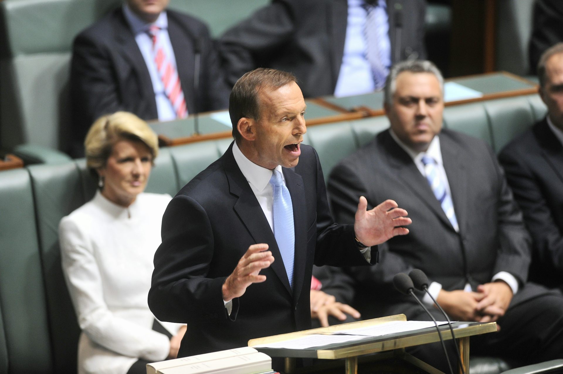 While conjuring ghosts of Labor past with clarion calls of class struggle, Abbott was also trying to deny Gillard and Swan their claims to it, using his speech to mourn a “once honourable party”. This was, of course all done with tongue firmly planted in his check. Abbott wants to replace the Light on the Hill with the Right on the Hill by appealling to Labor voters.
