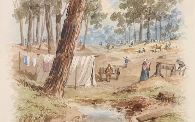 Histories of the Victorian gold rushes often overlook women’s presence on the goldfields in 1852. Women, children and home, however, were always part of goldfields life.