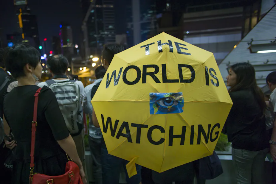 Back then, the movement was focused on the right to universal suffrage, a fair and transparent electoral system, and ultimately an open democratic process. Pacifist symbols (yellow umbrellas, protective face masks and eye goggles) were deployed against police aggression (pepper spray and tear gas) – and the so-called “Umbrella Revolution” was born.