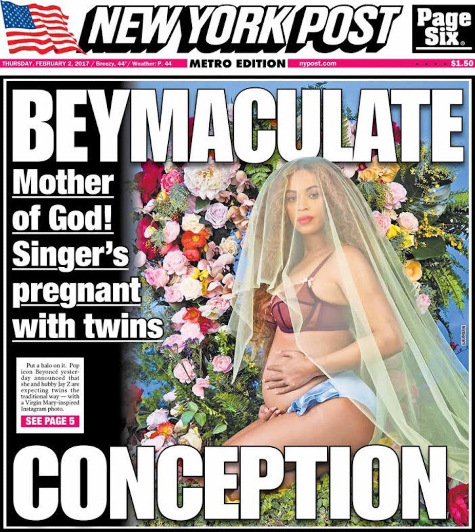 While the Guardian and Vox picked up on the Virgin Mary imagery and its associations with authority and virtue, The New York Post went the furthest, dedicating its front page to the “Beymaculate Conception”.