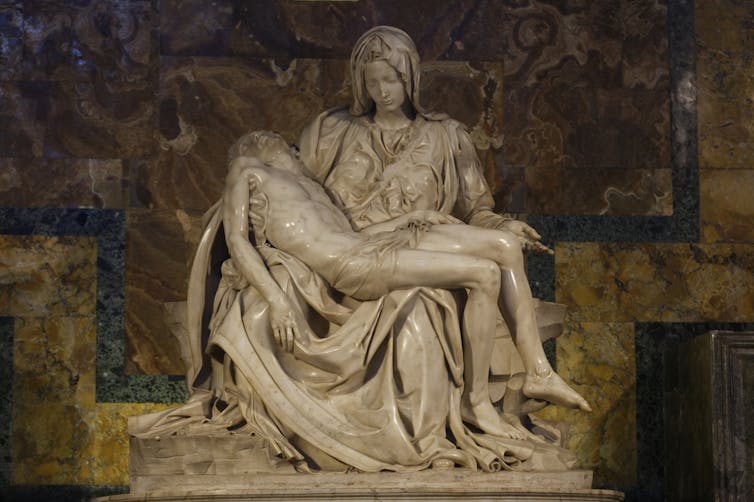 But Beyoncé doesn’t simply create a powerful and iconic image of black femininity in her pregnancy announcement images. Images of the Virgin Mary usually depict her fully clothed, including a head covering. The Virgin Mary’s attire must suggest chastity, purity and (sexual and spiritual) virtue. Beyoncé also subverts this ideal by posing in mismatched lingerie, cradling her pregnant belly, and in doing so fuses elements of the “Jezebel”, one of the most prominent stereotypes of black women, with Virgin Mary imagery. This boldly challenges concepts of “acceptable” female sexuality and racialised stereotypes.