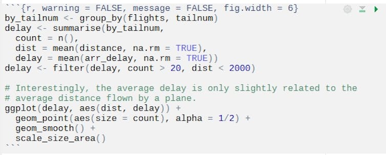 We can see examples of this in microbiology, ecology, political science and archaeology. Instead of mousing around menus and buttons, manually editing cells in a spreadsheet and dragging files between several different software programs to obtain results, these researchers wrote scripts. Their scripts automate the movement of files, the cleaning of the data, the statistical analysis, and the creation of graphs, figures and tables. This saves a lot of time when checking the analysis and redoing it to explore different options. And by looking at the code in the script file, which becomes part of the publication, anyone can see the exact steps that produced the published results.