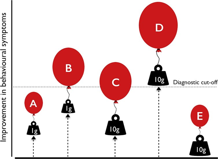 This theory helps to explain why autistic people can be so different from each other. Some autistic people, like the person represented by balloon E, have many psychological difficulties but few compensatory strategies leading to more autistic symptoms. Other people with autism, like D, might have so many strategies they no longer reach the diagnostic criteria for autism. So although compensatory strategies might be useful, if they prevent a person being diagnosed, it may mean they don’t get the help they need. Compensating can make it difficult for others to notice that someone is autistic, which might explain why some people, like Packham, are not diagnosed until adulthood.