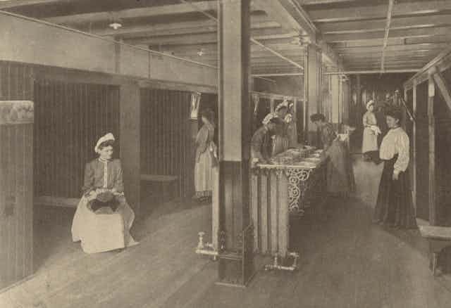 Architects and other planners began to cordon off various public spaces for the exclusive use of women. For example, a separate ladies’ reading room – with furnishings that resembled those of a private home – became an accepted part of American public library design. And in the 1840s, American railroads began designating a “ladies’ car” for the exclusive use of women and their male escorts. By the end of the 19th century, women-only parlor spaces had been created in other establishments, including photography studios, hotels, banks and department stores.